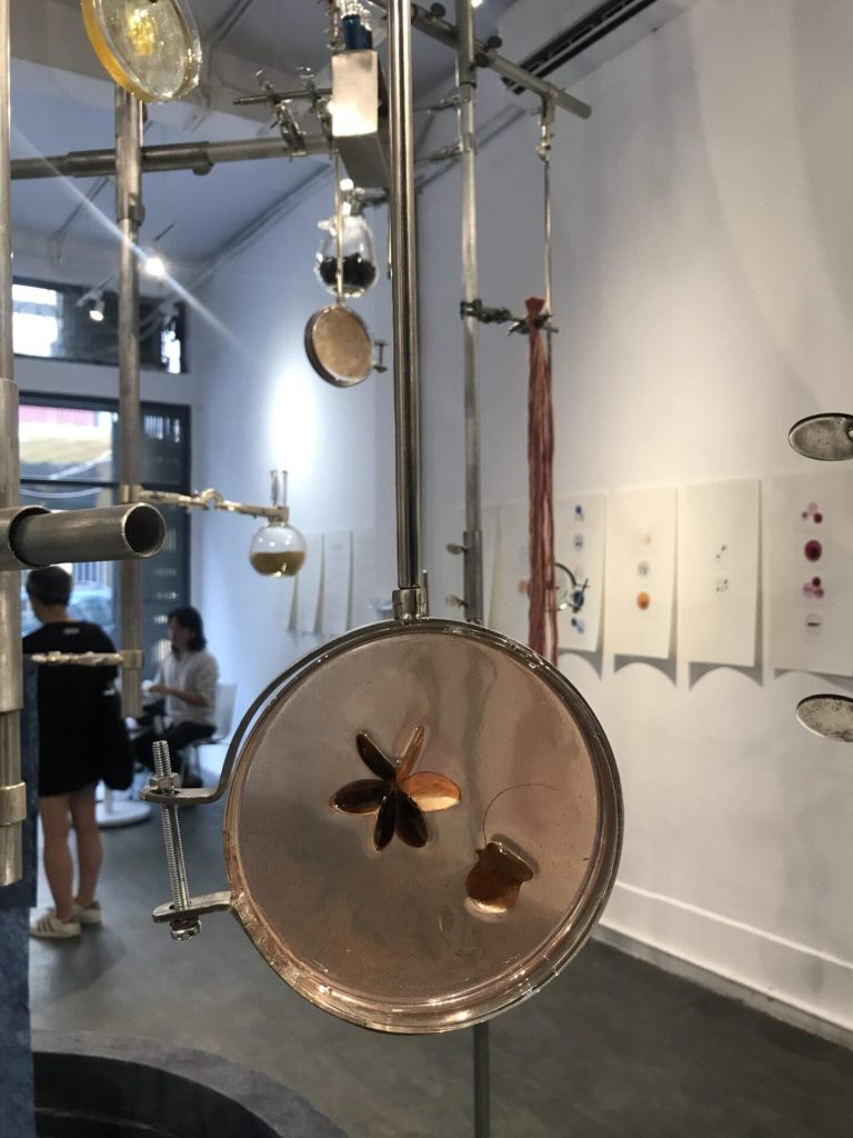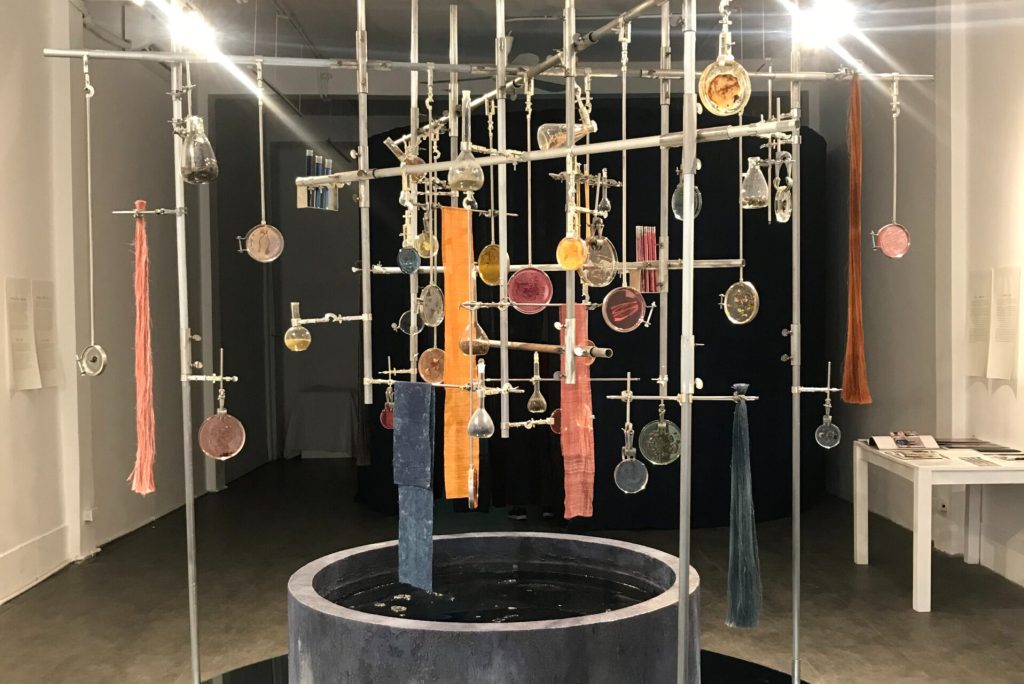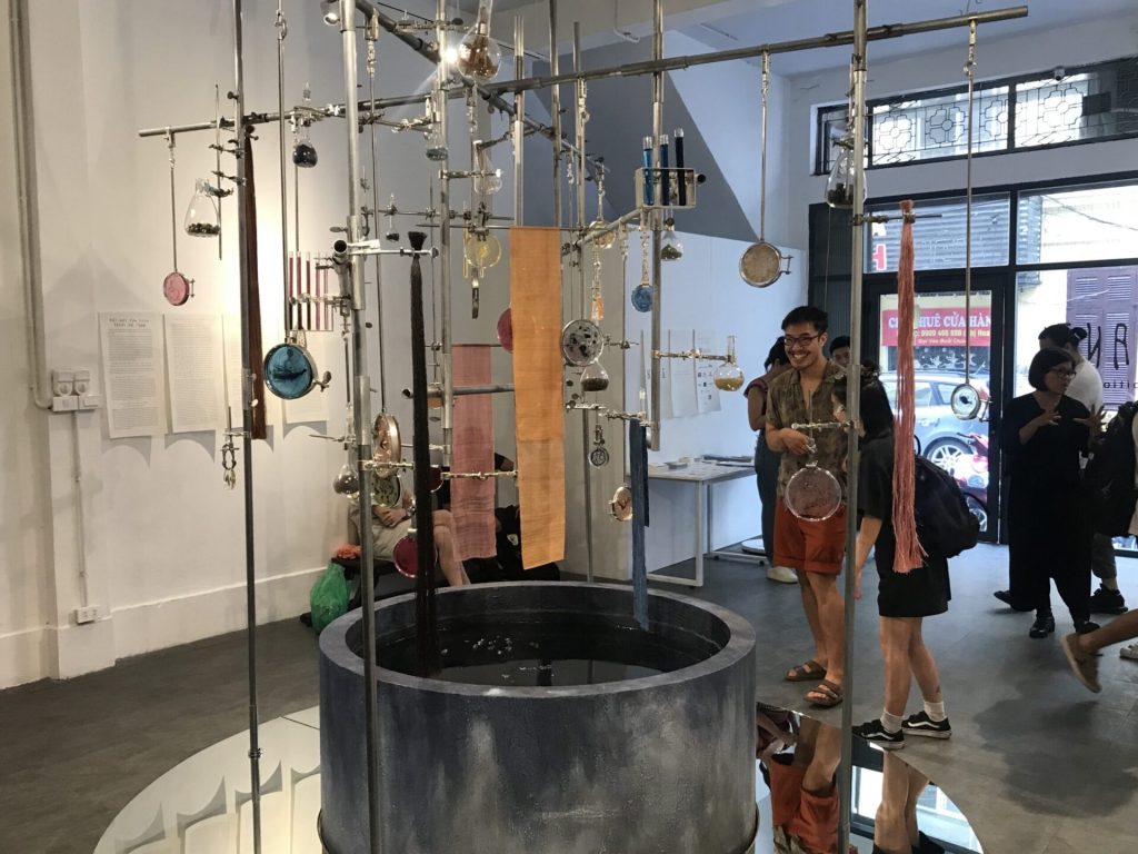 Triển lãm sắp đặt gồm hai tác phẩm, đầu tiên là Phòng Thí nghiệm cao khoảng 2m và bán kính khoảng 1m đặt giữa không gian triển lãm, gây ấn tượng mạnh với người xem. Ở giữa tác phẩm là một bể màu chàm – một thành phần trong kĩ thuật nhuộm màu tự nhiên của các dân tộc ở Việt Nam. Bên trên đó, rất nhiều chi tiết trong chu trình dệt – nhuộm truyền thống như các loại lá, hoa được sử dụng để nhuộm vải hay các loại bột sau công đoạn chế biến được sắp đặt trong các loại ống nghiệm với hình dáng và kích thước khác nhau, sắp đặt theo mô phỏng một cuộc thí nghiệm hiện đại. Màu sắc bắt mắt và bố cục cân xứng của tác phẩm tạo ra cảm giác hài hòa. Ngược lại, sự tương phản từ cấu trúc dạng tròn của bể chàm và các ống nghiệm và các thanh xuyên thẳng, đâm ngang, cũng như sự đối lập giữa các chất liệu cứng, chắc và những dải vải, bó sợi mềm mại phất phơ tạo nên sự phức tạp thú vị.