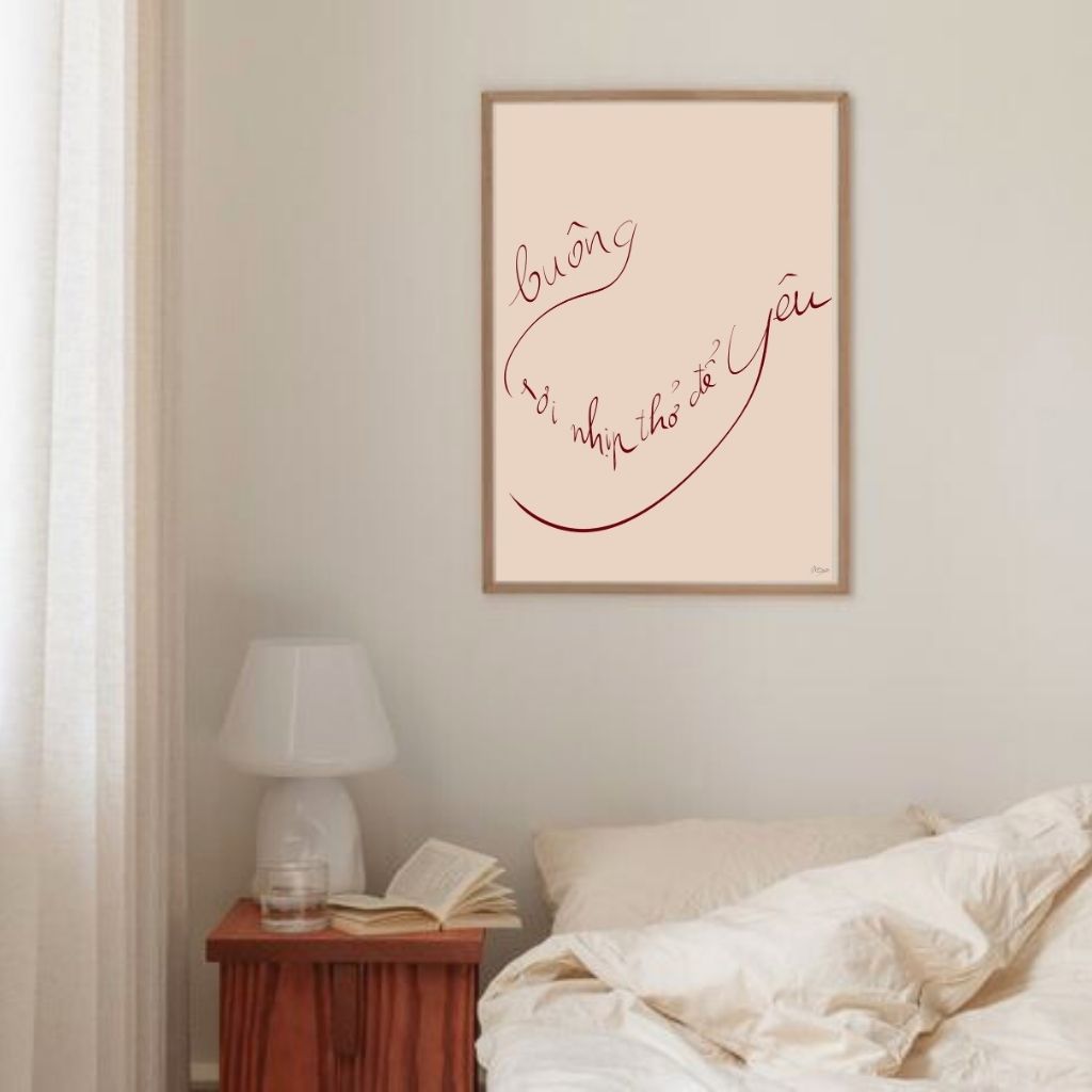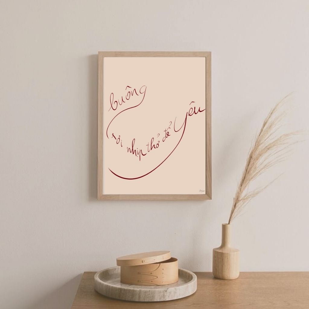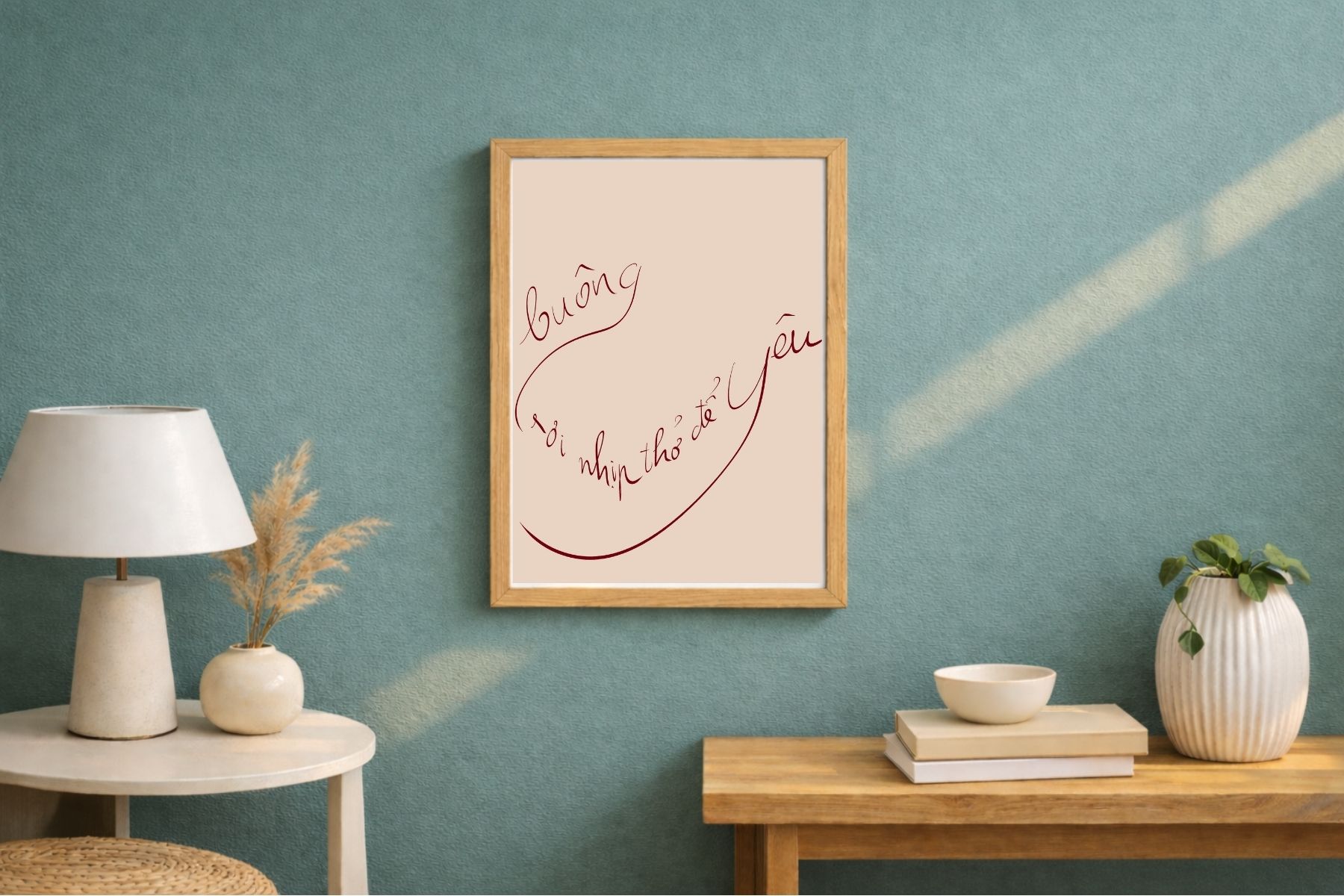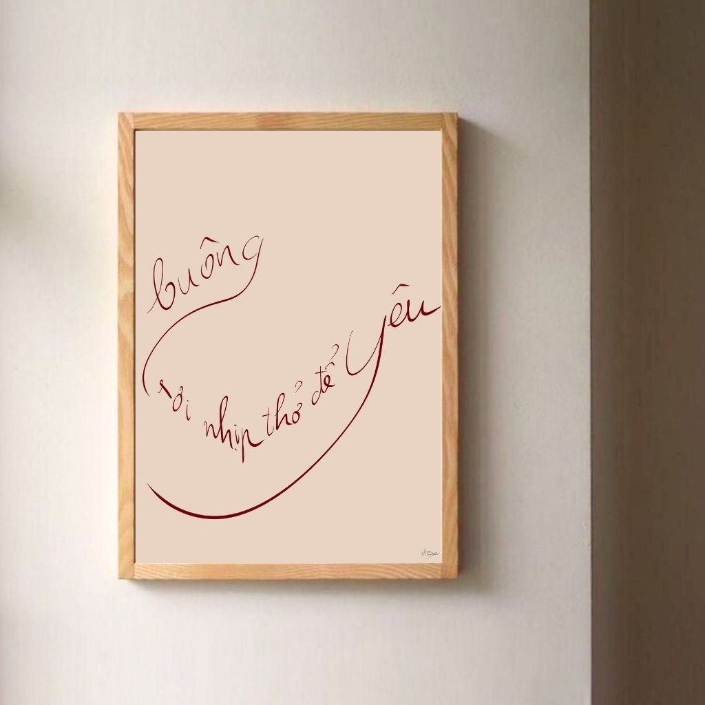 Kích thước gợi ý: A2 hoặc Khổ vuông (Để tạo sự cân bằng và cảm giác bao la). Tranh nên đi kèm khung gỗ sáng màu dày 2-3cm thanh mảnh.